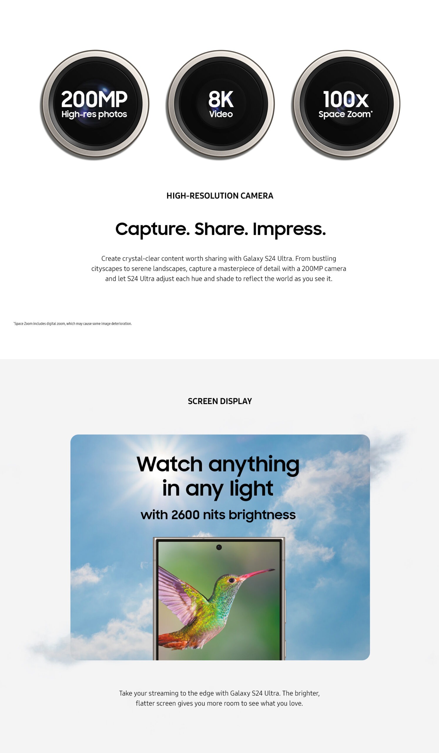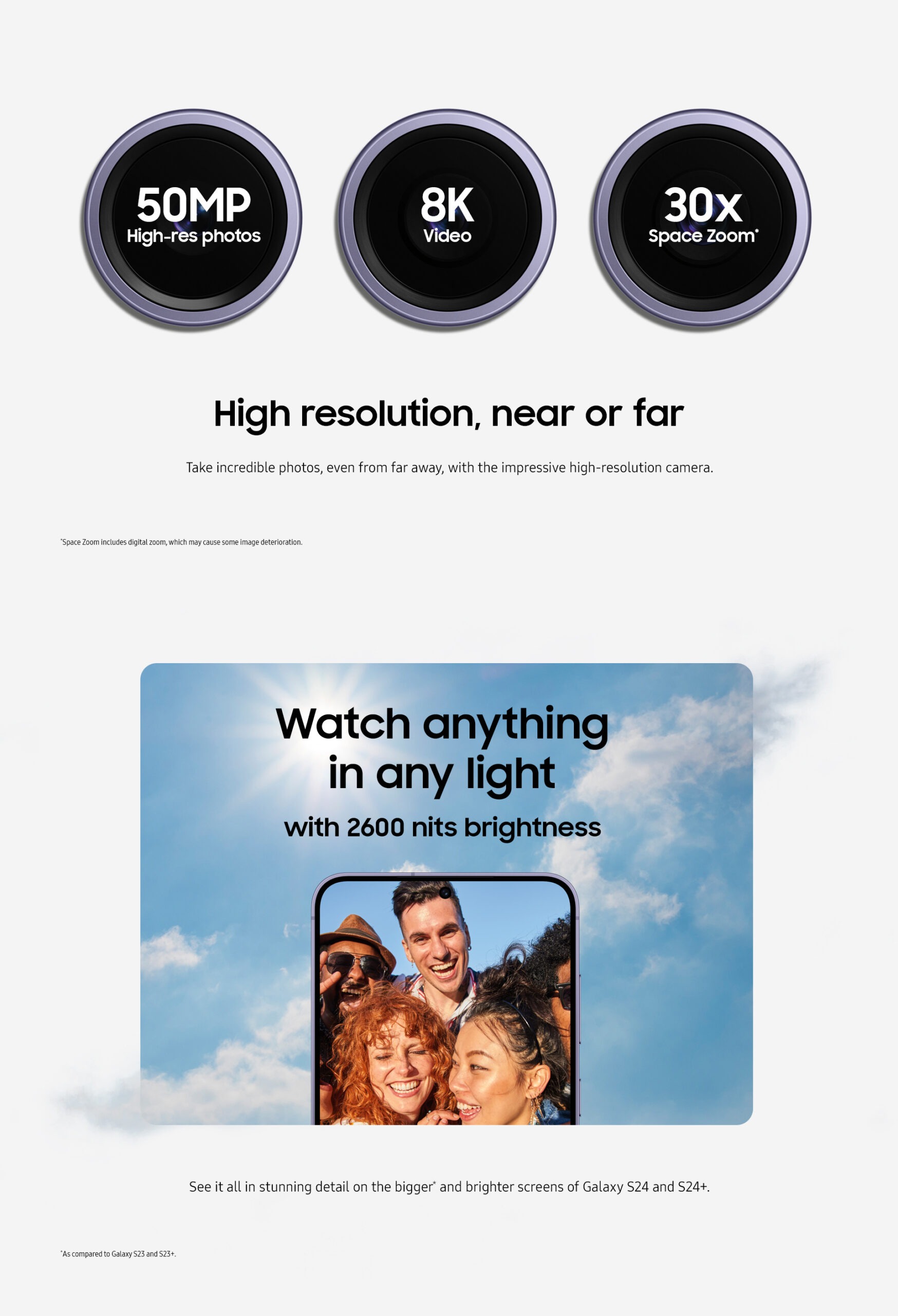 7. The Dynamic AMOLED 2X display on Galaxy S24 and S24+ received a certification from VDE Germany for 100 percent Mobile Color Volume in the DCI-P3 color range, which means your images aren’t washed out and you’ll get unbelievably vivid colors regardless of differing levels of brightness. The display can achieve peak brightness of up to 2600 nits, improving the contrast between dark and light aspects of digital content for a more brilliant picture quality, with a 5,000,000:1 contrast ratio to make your mobile experience more immersive.