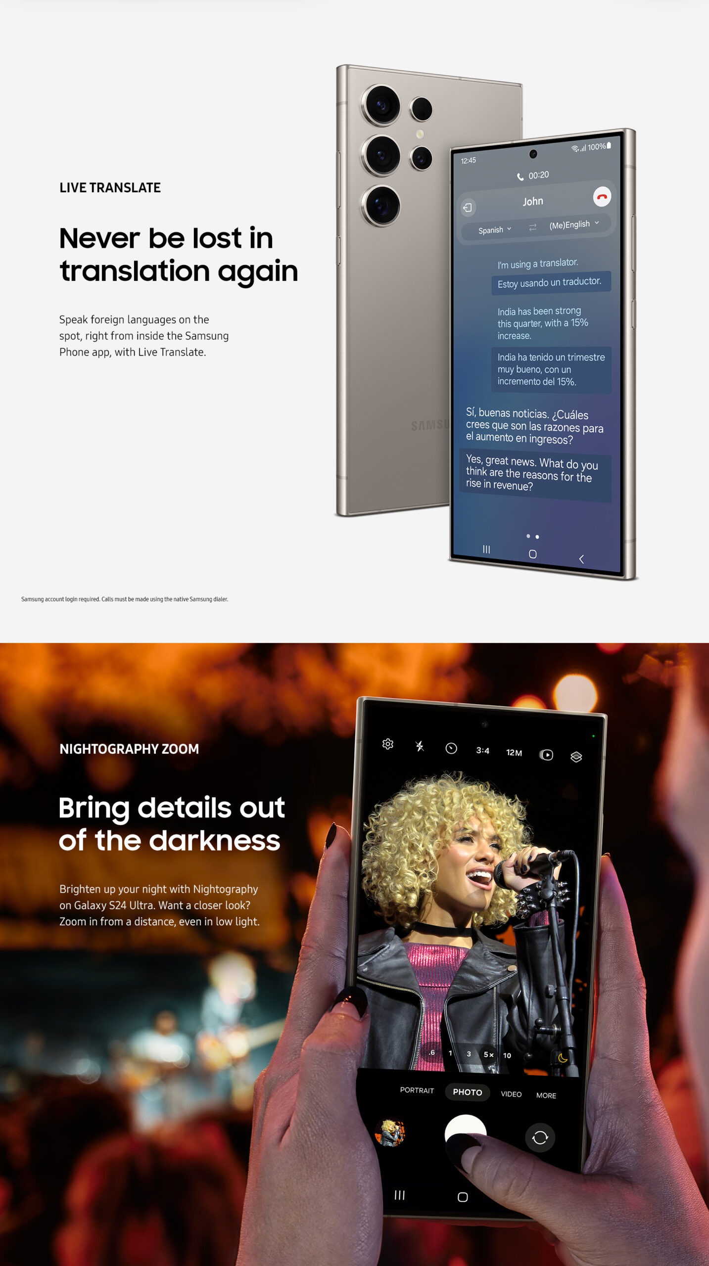 2 Samsung account log-in required. Calls must be made using the native Samsung dialer.