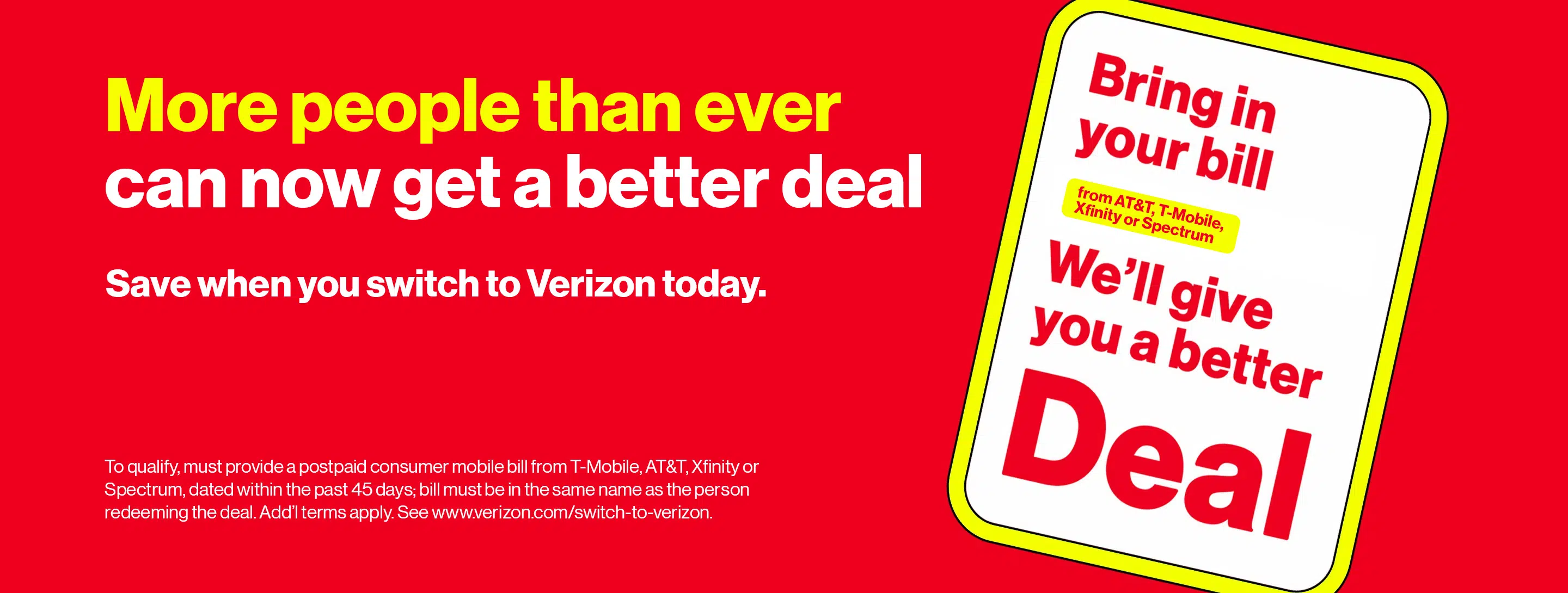 Make sure to bring the part of your bill that clearly shows your name, address, phone numbers, bill date, current plan details, device payments and price. You can bring a physical, digital or pdf copy of your bill. To qualify for the Better Deal offer, you must provide a postpaid mobile bill from T-Mobile or AT&T from within the past 45 days. The bill must be in the same name as the new account owner switching service to Verizon.